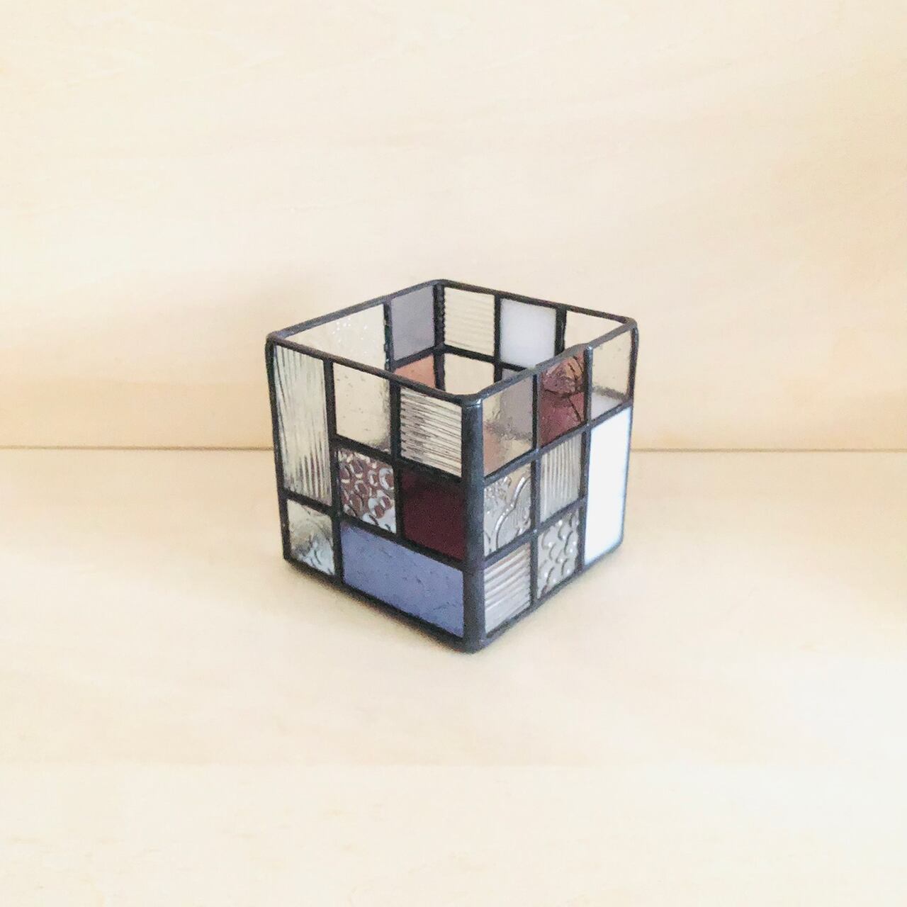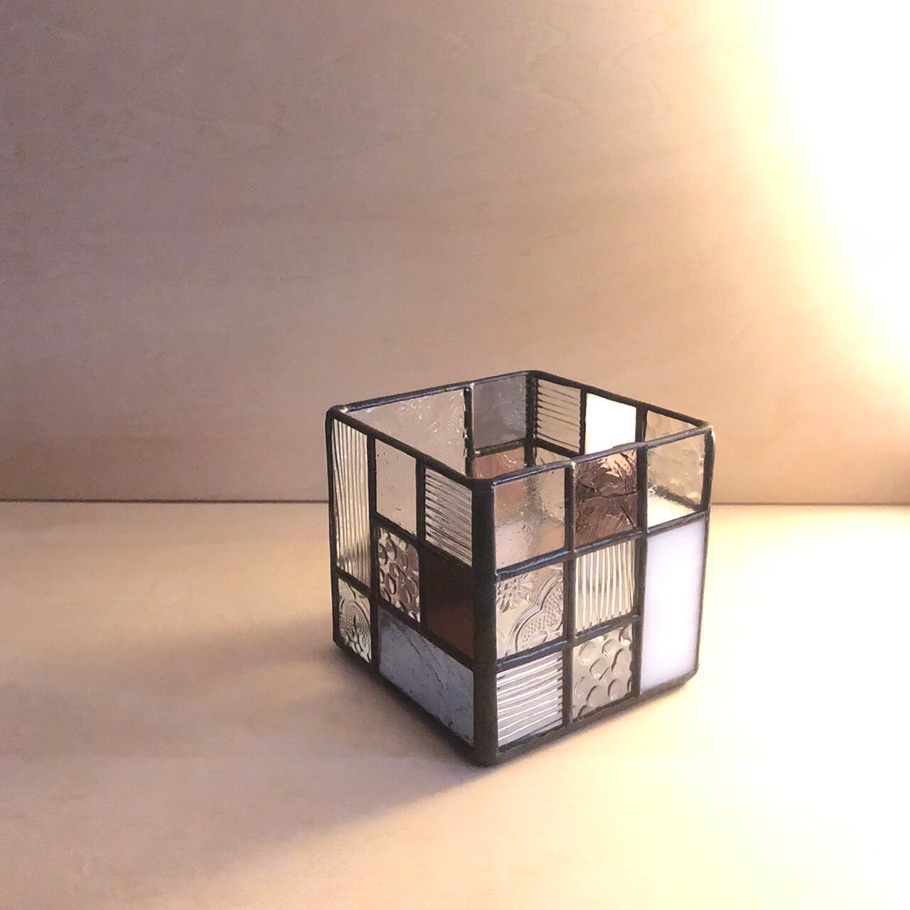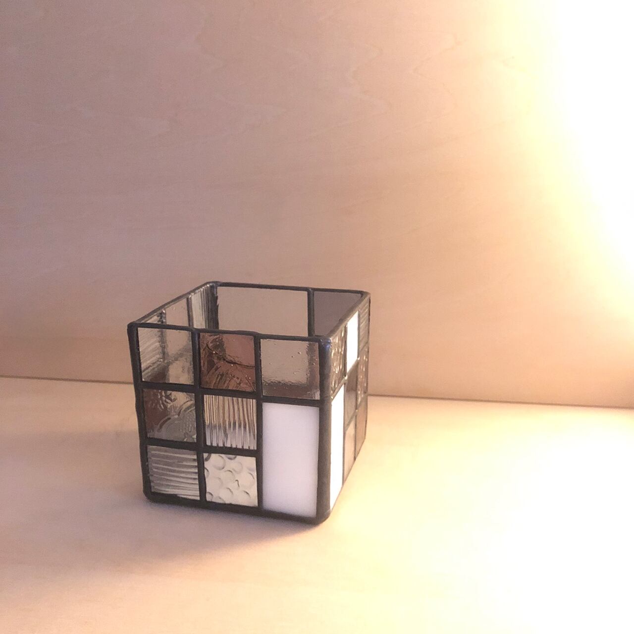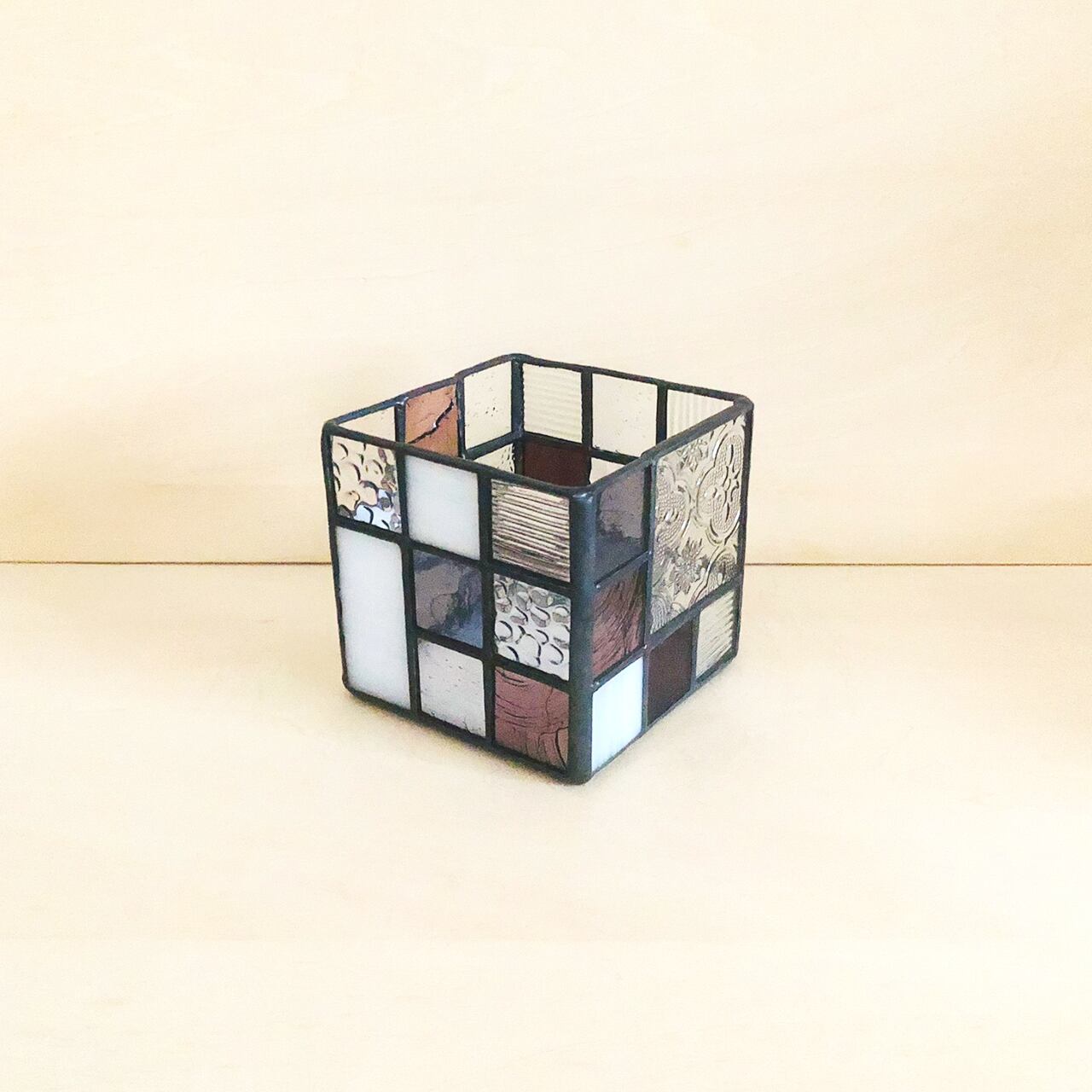 ステンドグラスの手法で制作した立方体の入れ物