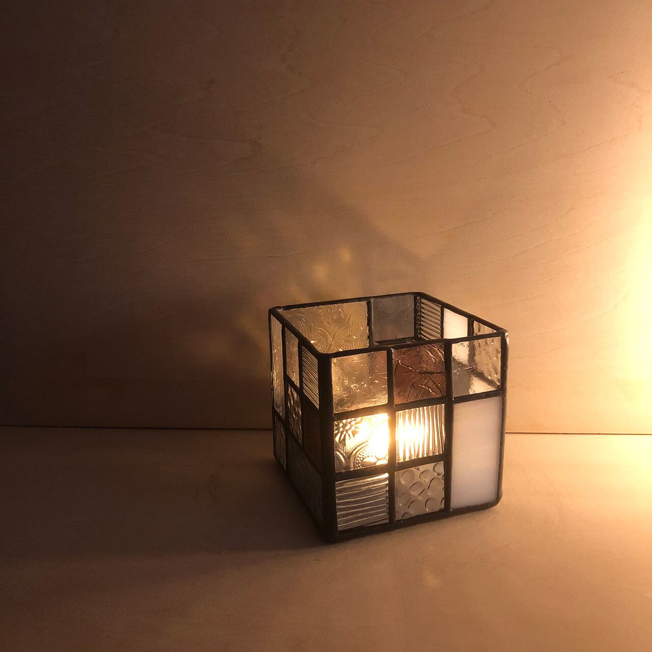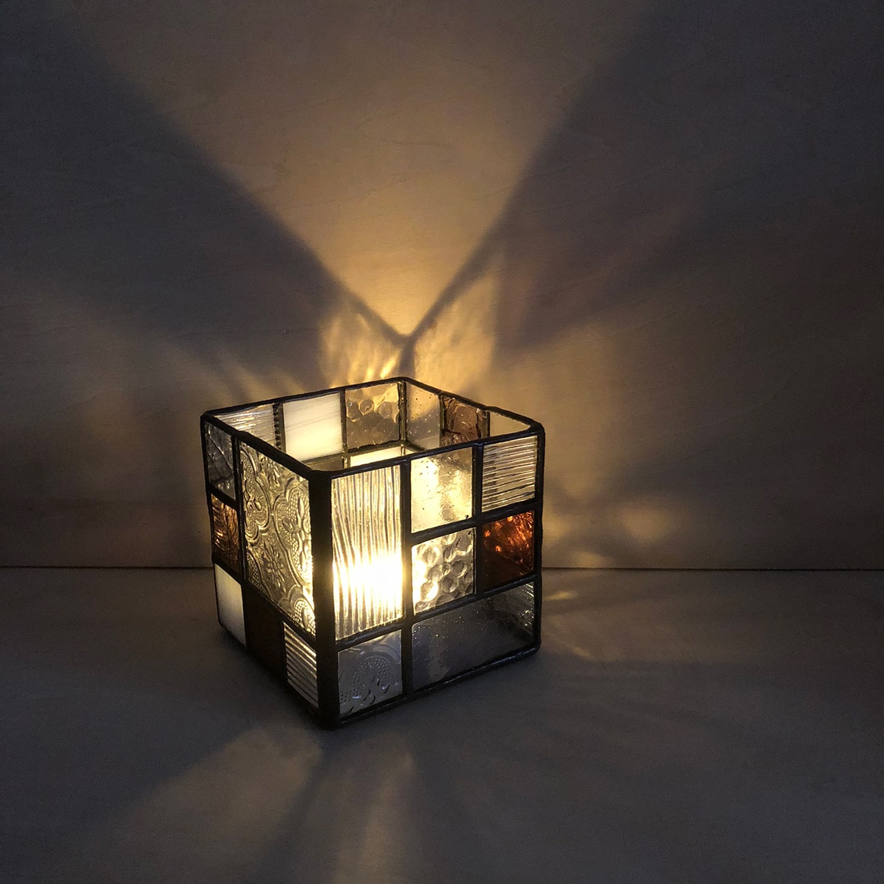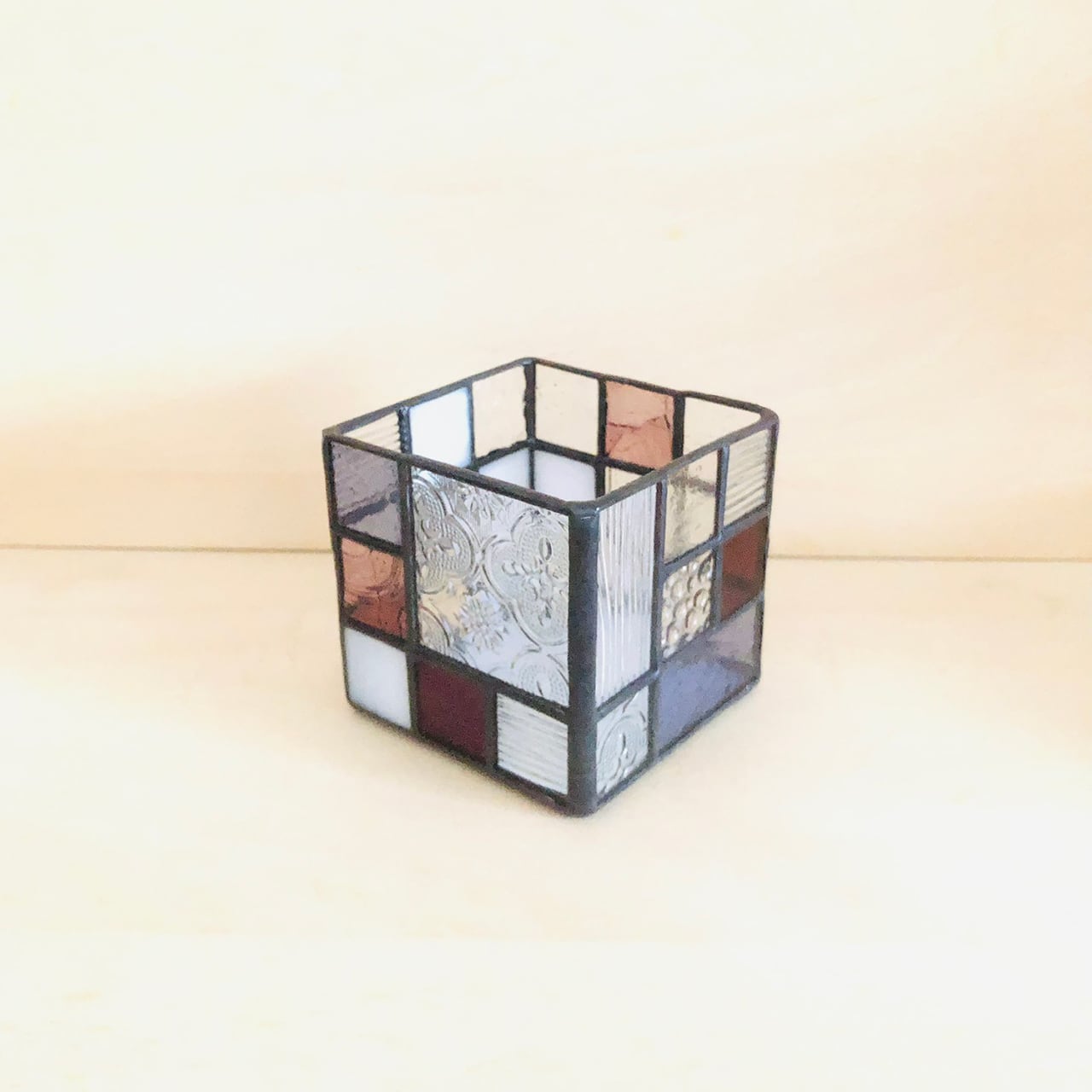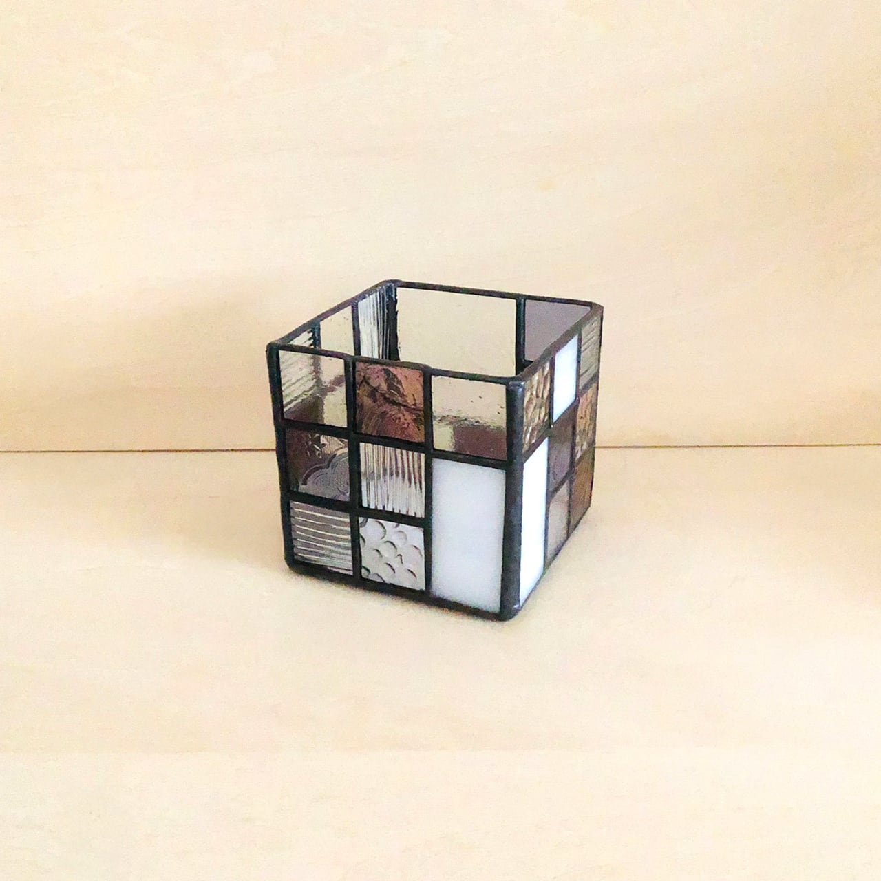 ステンドグラスの手法で制作した立方体の入れ物